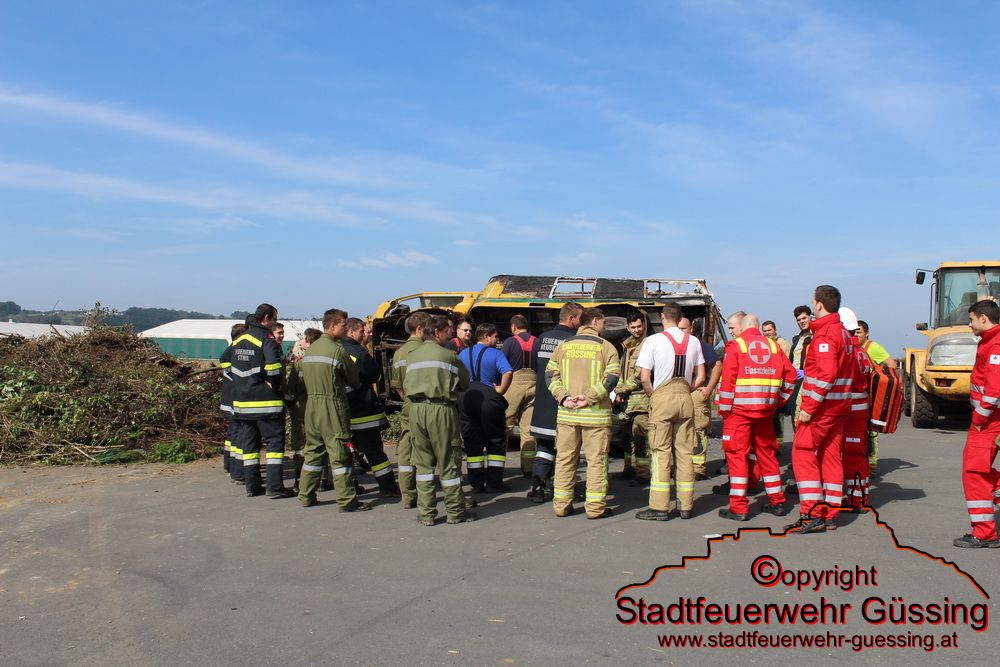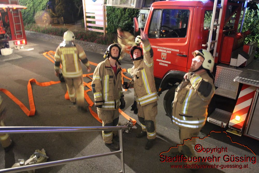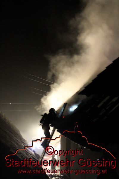 Am Donnerstag, dem 27.11.2014, wurden wir um 09:13 Uhr zu einem Brand in einer Industrieanlage in Güssing gerufen. Aus noch unbekannter Ursache geriet eine Maschine in einem freistehendem Gebäude in Brand. Dabei entstand vermutlich durch eine Verpuffung eine Druckwelle. Diese riss das Garagentor aus der Verankerung. Besonders gefährlich war die Brandbekämpfung, da in der vorderen Hälfte des Raumes zwei Gasflaschen und ein Autogenschweißgerät gelagert wurde. Diese wurden während des Löschvorgangs besonders gekühlt und anschließend zur Sicherheit in einem Wasserbad gelagert. Der Brand konnte nach ca. 15 Minuten gelöscht werden.