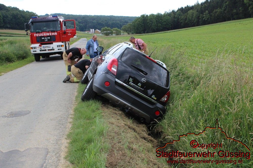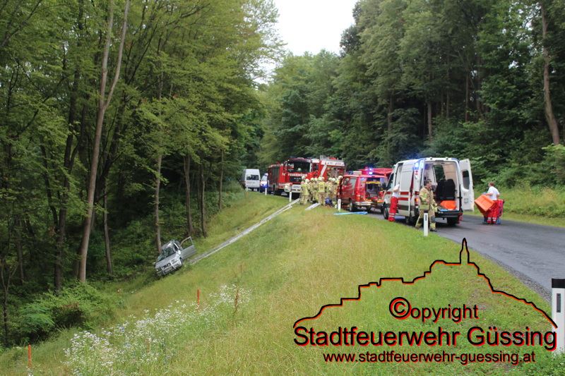 Am Donnerstag, dem 10.07.2014, wurden wir um 18:32 Uhr zu einem Verkehrsunfall mit eingeklemmter Person in der Bergstraße Richtung Kleinmürbisch gerufen. Ein PKW mit zwei Insassen war von der Straße abgekommen, überschlug sich eine steile Böschung hinunter und blieb dann an einem Baum. Eine Person konnte sich selbst aus dem Fahrzeug befreien. Die andere noch im Fahrzeug verbliebene Person wurde nach der Erstversorgung durch den Notarzt aus dem Fahrzeug gerettet. Die unbestimmten Grades Verletzte wurde mit dem Notarzthubschrauber ins Krankenhaus geflogen. Die PKW-Lenkerin wurde mit dem Notartztwagen ins Krankenhaus gebracht. Anschließend wurde das Fahrzeug geborgen.