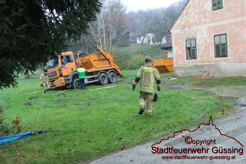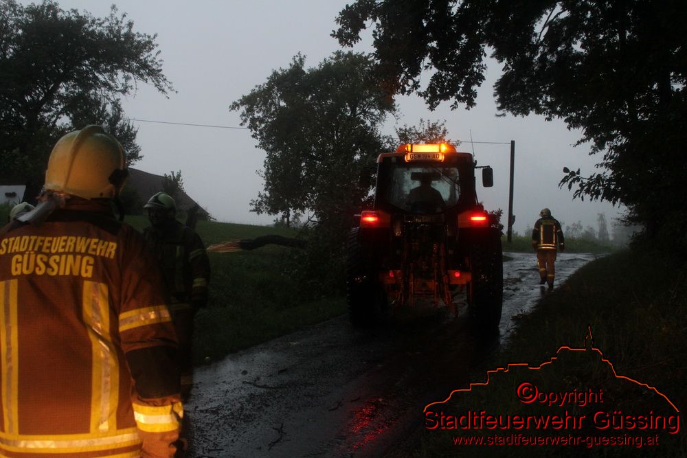 Am Mittwoch, dem 30.07.2014 wurden wir um 16:27 Uhr zum Unwettereinsatz in Güssing gerufen. Zahlreiche durch den Sturm umgeworfenen Bäume mussten von den Straßen entfernt werden. Durch die heftigen Regenfälle war in kürzester Zeit die Kanalisation überlastet und einige Kanaldeckel auf den Straße wurden weggespült - Diese mussten wieder eingesetzt werden. Außerdem wurden etliche Pumparbeiten in Kellern und Gräben durchgeführt. Bei einigen Häusern wurde ein kleiner Damm errichtet, um das Wasser am Eindringen in die Häuser zu hindern. In Langzeil hatte eine Mure den Zaun eines Tiergeheges weggespült. Die entlaufenen Tiere (Hirsche und Muffel) wurden wieder in das Gatter zurückgetrieben und der Zaun provisorisch verschlossen.