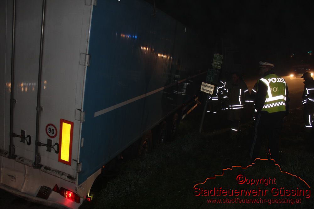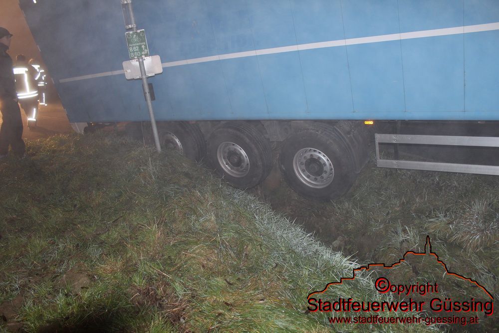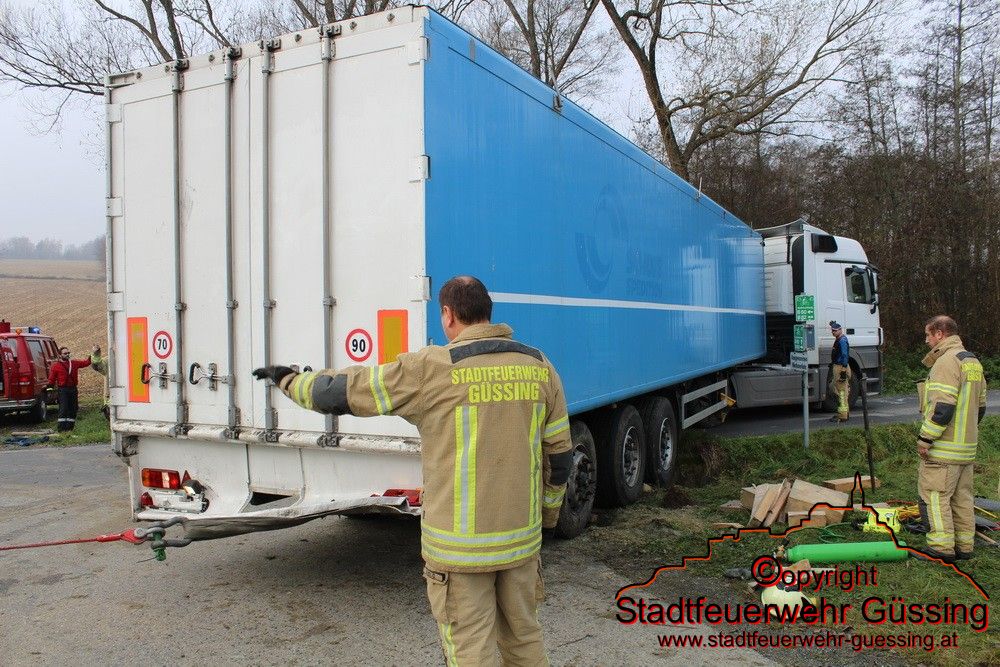 Am Mittwoch, dem 12.11.2014, wurden wir um 5:18 Uhr zu einer LKW-Bergung zwischen Sulz und Gamischdorf gerufen. Ein LKW-Fahrer wollte mit seinem vollbeladenen Sattelzug auf einer Kreuzung umdrehen und rutschte dabei mit der rechten hinteren Seite in einen tiefen Straßengraben. In weiterer Folge lag der Sattelzug voll am Bankett auf. Da eine Bergung mit der Seilwinde in der anfängliche Lage aufgrund eines unter dem LKW liegendem Brückenkopfes nicht möglich war, brachte die Stadtfeuerwehr Güssing den Aufleger mittels Hebekissen in eine waagrechte Position. Anschließend wurde der mit 23 Tonnen Getränkedosen mit einem Gabelstapler entladen. In weiterer Folge wurde am Aufleger ein defekter Reifen gewechselt und eine provisorische Auffahrtsrampe errichtet. Die Bergung wurde dann mittels Seilwinde durchgeführt.