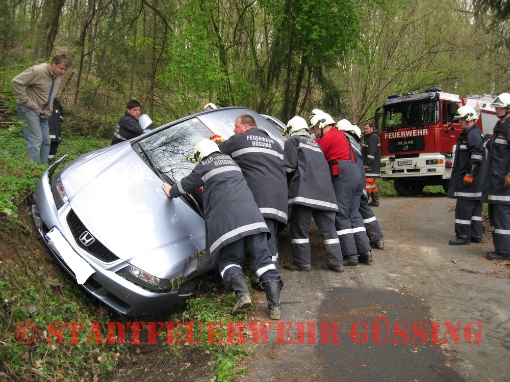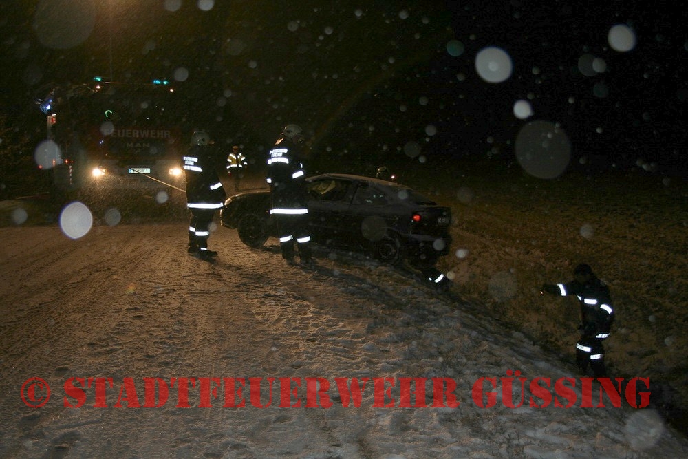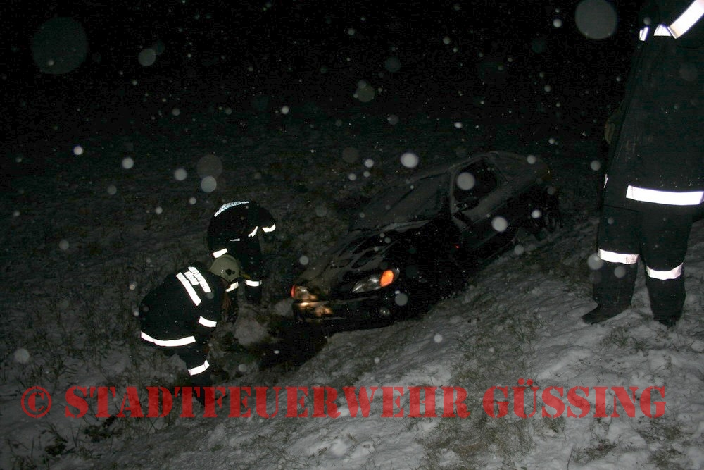 Am 28.11.2010 wurden wir gegen 21:30 Uhr zu einer PKW-Bergung auf der B56 zwischen Güssing und Urbersdorf gerufen. Ein PKW war auf der schneeglatten Fahrbahn ins Schleudern gekommen und in einen Straßengraben gerutscht. Da das Fahrzeug auf einem Durchlass zu stehen kam, musste die Bergung mittels Hebekreuz und Kran durchgeführt werden. Die Stadtfeuerwehr war mit 6 Mann, KLFA, und SRF für ca. eine Stunde im Einsatz.