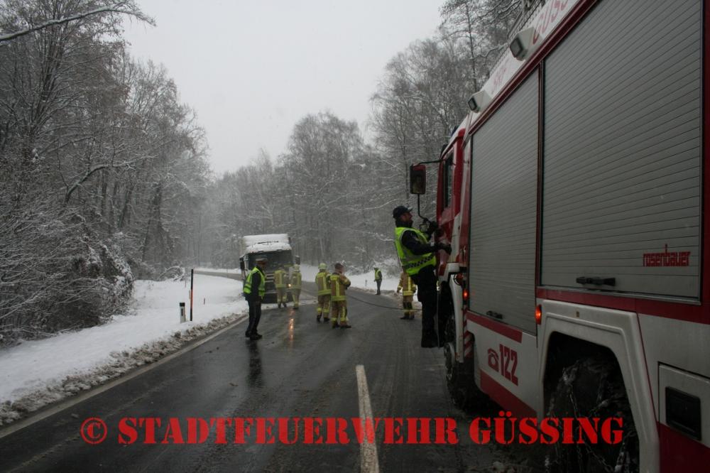 Am 21.01.2010, wurden wir um ca. 12:15 Uhr zu einer LKW-Bergung auf die B57 alarmiert. Ein LKW war bei schneeglatter Fahrbahn auf Bankett gekommen und blieb hängen. Die Stadtfeuerwehr Güssing war mit KLFA und SRF und 12 Mann im Einsatz. Die Bergung erfolgte mittels der Seilwinde unseres SRFs.