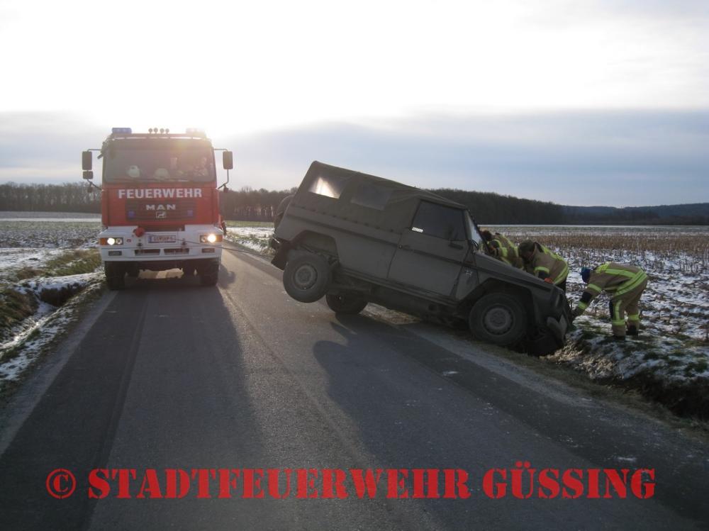 Am 3.12.2010 wurden wir um ca. 10:30 Uhr zu einer Pinzgauer-Bergung auf der B56 in Moschendorf gerufen. Der Pinzgauer war auf der schneeglatten Fahrbahn von der Straße abgekommen und in einen Graben gerutscht. Die Bergung erfolgte mittels Seilwinde. Die Stadtfeuerwehr war mit 11 Mann, KLFA, SRF und ULF für ca. 1 Std. im Einsatz
