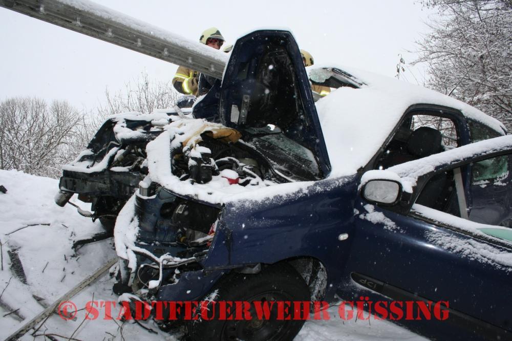 Am 08.01.2010, wurden wir gegen 15:45 Uhr zu einer PKW-Bergung nach Neusiedl bei Güssing alarmiert. Ein Fahrzeug war bei schneeglatter Fahrbahn von der Straße abgekommen und im Graben gelandet. Die Stadtfeuerwehr Güssing war mit KLFA und SRF und 9 Mann im Einsatz. Die Bergung erfolgte mittels Kran und Hebekreuz unseres SRFs.