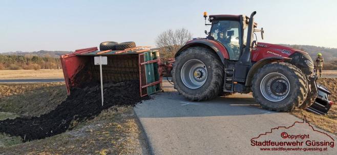 Am Donnerstag, dem 24.03.2022, wurden wir um 16:41 Uhr, zu einem Verkehrsunfall auf die B56 Höhe Urbersdorf gerufen. Ein Traktor mit Anhänger und ein PKW waren kollidiert. Dabei wurde der PKW in den Straßengraben geschleudert und beim Traktor kippte der Anhänger um. Nach der Versorgung der Verletzten, begannen die Bergungsarbeiten. Der Anhänger wurde mittels Krans und Seilwinde aufgestellt und mit einem weiteren Traktor abtransportiert. Der PKW wurde mittels Seilwinde geborgen und in einer Einfahrt abgestellt. Für den beschädigten Traktor wurde vom Eigentümer ein Spezialunternehmen mit dem Abtransport beauftragt. Vielen Dank für die gute Zusammenarbeit mit Polizei und Rotem Kreuz