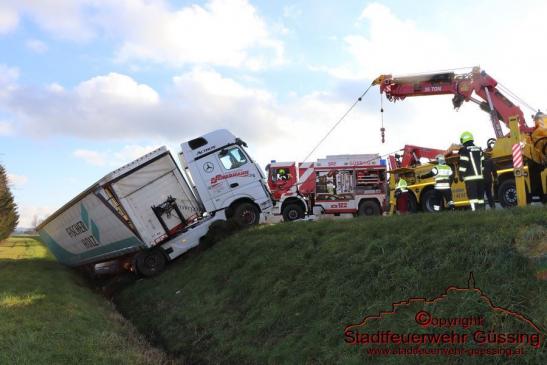 Am Dienstag, dem 06.12.2022, wurden wir um 10:41 Uhr zu einem Verkehrsunfall zwischen einem LKW und einem PKW auf die B57 Höhe Dt. Tschantschendorf gerufen. Die Feuerwehren Dt. Tschantschendorf und St. Michael waren bereits im Vorfeld zur Menschenrettung alarmiert worden. Am Einsatzort angekommen wurde leider festgestellt, dass es bei dem Unfall ein Todesopfer zu beklagen gab. Es wurde noch das angrenzende Feld abgesucht, da man nicht wusste, wie viele Personen sich im Fahrzeug befunden hatten. Der LKW-Lenker wurde leicht verletzt ins Krankenhaus gebracht. Nach den Erhebungen der Staatsanwaltschaft und Polizei wurden wir gemeinsam mit einem Abschleppunternehmen mit der Bergung des Sattelschleppers beauftragt. Der beteiligte PKW wurde von der Feuerwehr Stegersbach abtransportiert. Mit Hilfe von 2 Seilwinden des Abschleppunternehmens und 2 Seilwinden von unserem SRF und ULF wurde die Bergung des Fahrzeuges durchgeführt. Dabei wurde auch festgestellt, dass der Treibstofftank einen Riss hatte. Dieser wurde sofort provisorisch abgedichtet und im Anschluss die 800 Liter Diesel aus den beiden Tanks abgepumpt. Schlie?lich konnte die Bergung fortgesetzt werden und der LKW wieder auf die Straße gebracht werden.