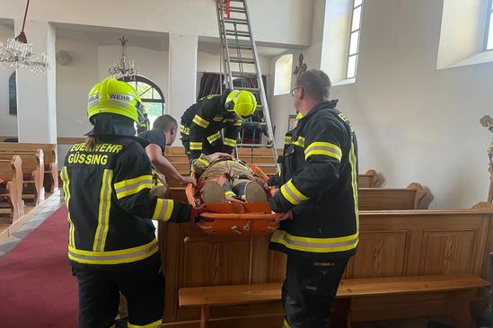 Eine Person wurde über die Chorstiegen mithilfe der Schleifkorbtrage abgeseilt. Die zweite verletzte Person wurde vom Glockenturm über Leitern ebenfalls mittels Schleifkorbtrage gerettet.