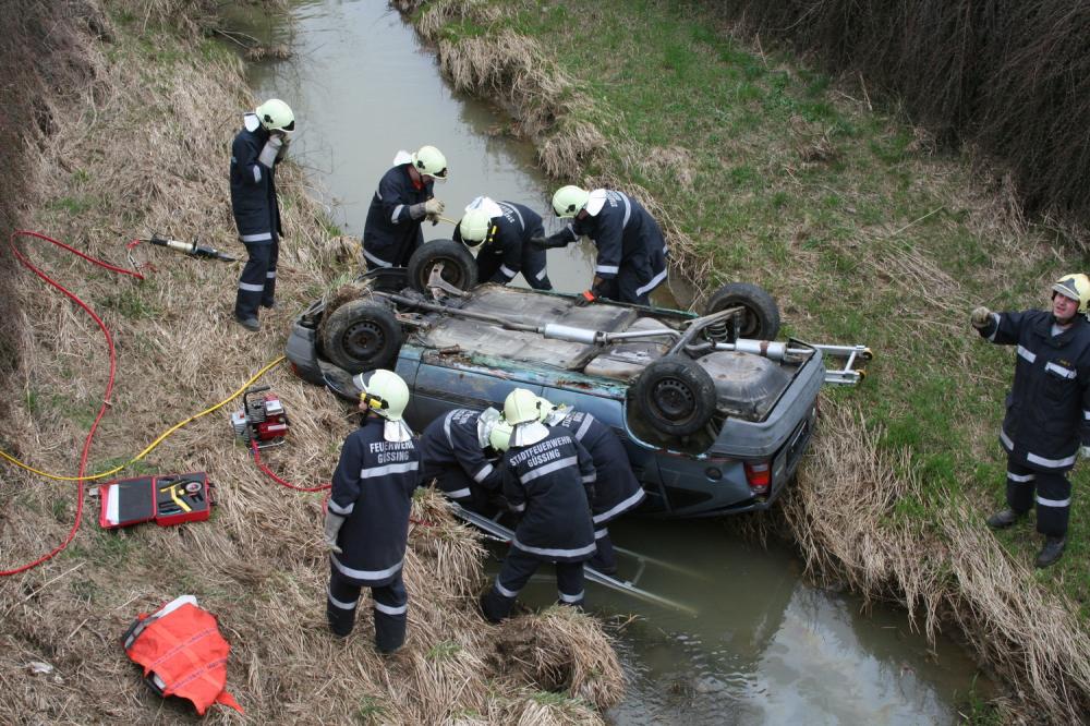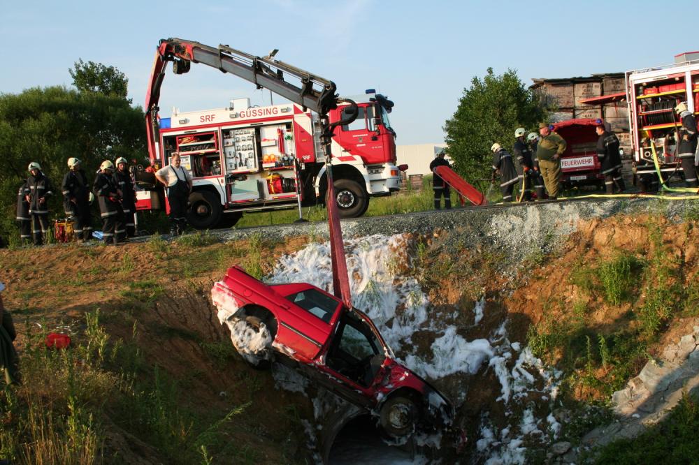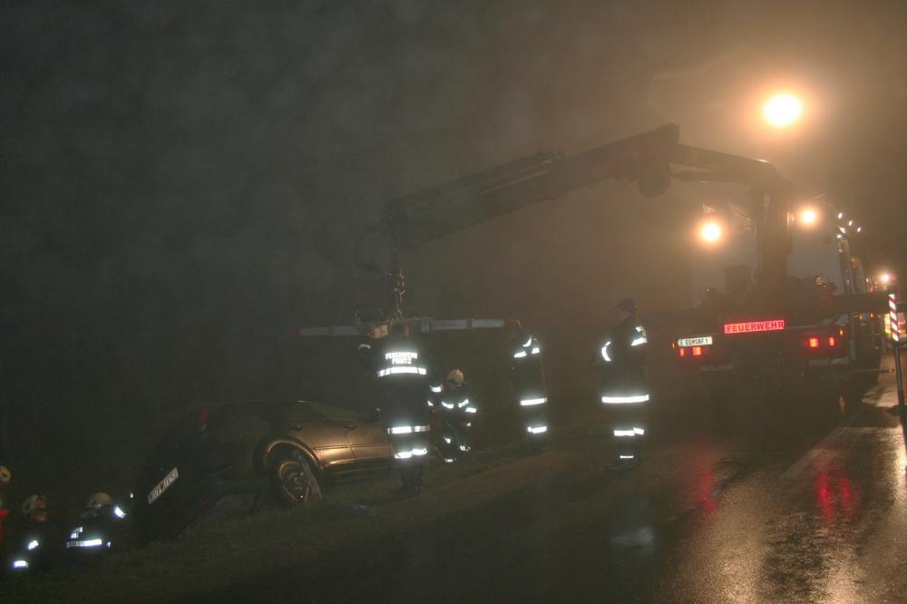 Am 21.05.2009 um 01.30Uhr, wurden wir über die FAZ zu einer PKW Bergung nach Olbendorf gerufen. Ein Fahrzeug war von der Strasse abgekommen, über einen Hang gerollt und an einer Böschungsmauer zum stehen gekommen. Die Lenkerin konnte sich selbst aus dem Unglückswagen befreien, wurde aber zur genaueren Abklärung mit einem Sanitätswagen des Roten Kreuzes ins LKH gebracht. Das Fahrzeug wurde mittels Kran unseres SRF's geborgen.