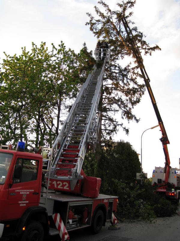 Am 17.4.2009 wurden wir in die Grabenstrasse gerufen. Die Eigentümer befürchten, dass eine ca. 25m hohe Fichte bei den immer öfter auftrettenden starken Winden, umfallen würde. Das Abtragen des Baumes erfolgte aufgrund der beengten Verhältnissen mittels unserer DLK und mittels Kran unseres SRF.